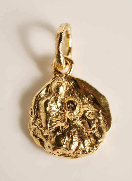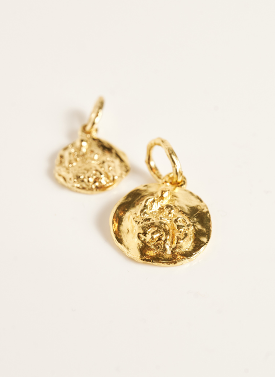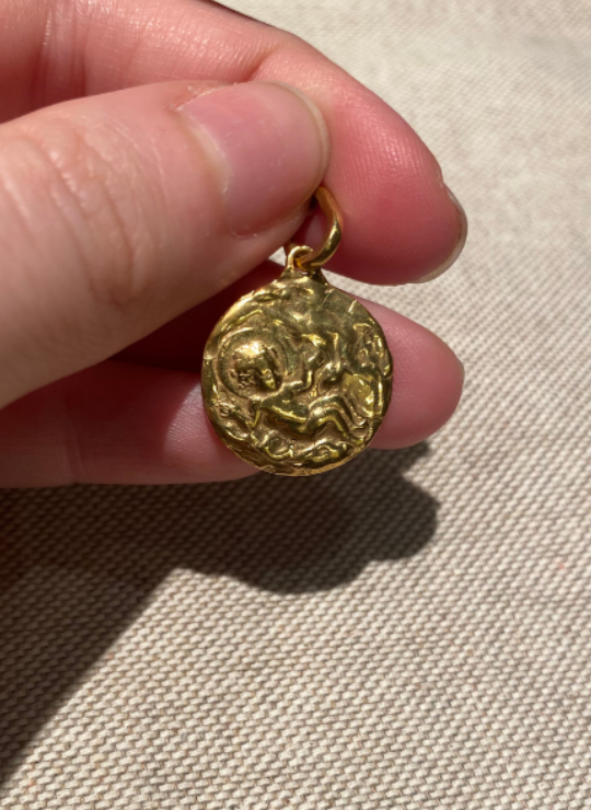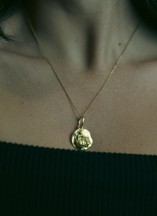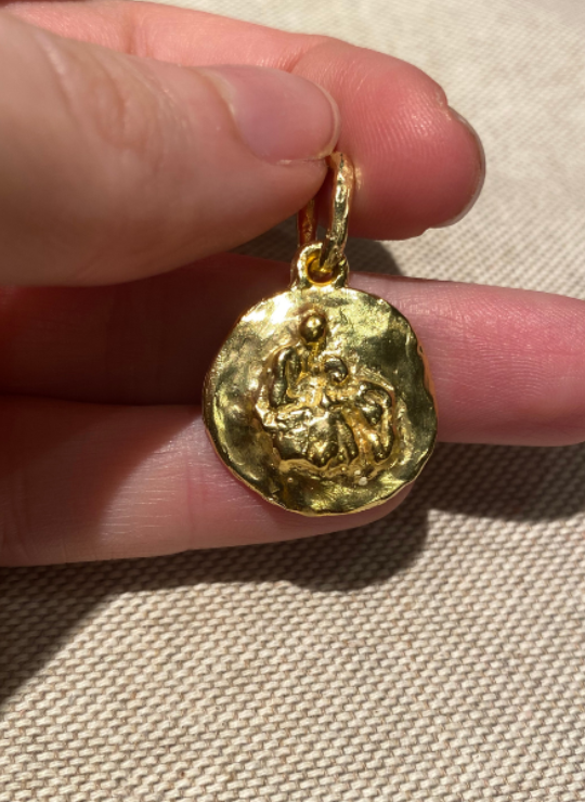 Medalla de oro elaborada artesanalmente, con un delicado cincelado a mano que resalta cada detalle con carácter único. Su acabado presenta un efecto rústico muy elegante, donde las pequeñas irregularidades aportan autenticidad y calidez. La textura envejecida de la plata resalta los relieves del diseño, creando una pieza con alma, perfecta para quienes aprecian la belleza de lo hecho a mano.