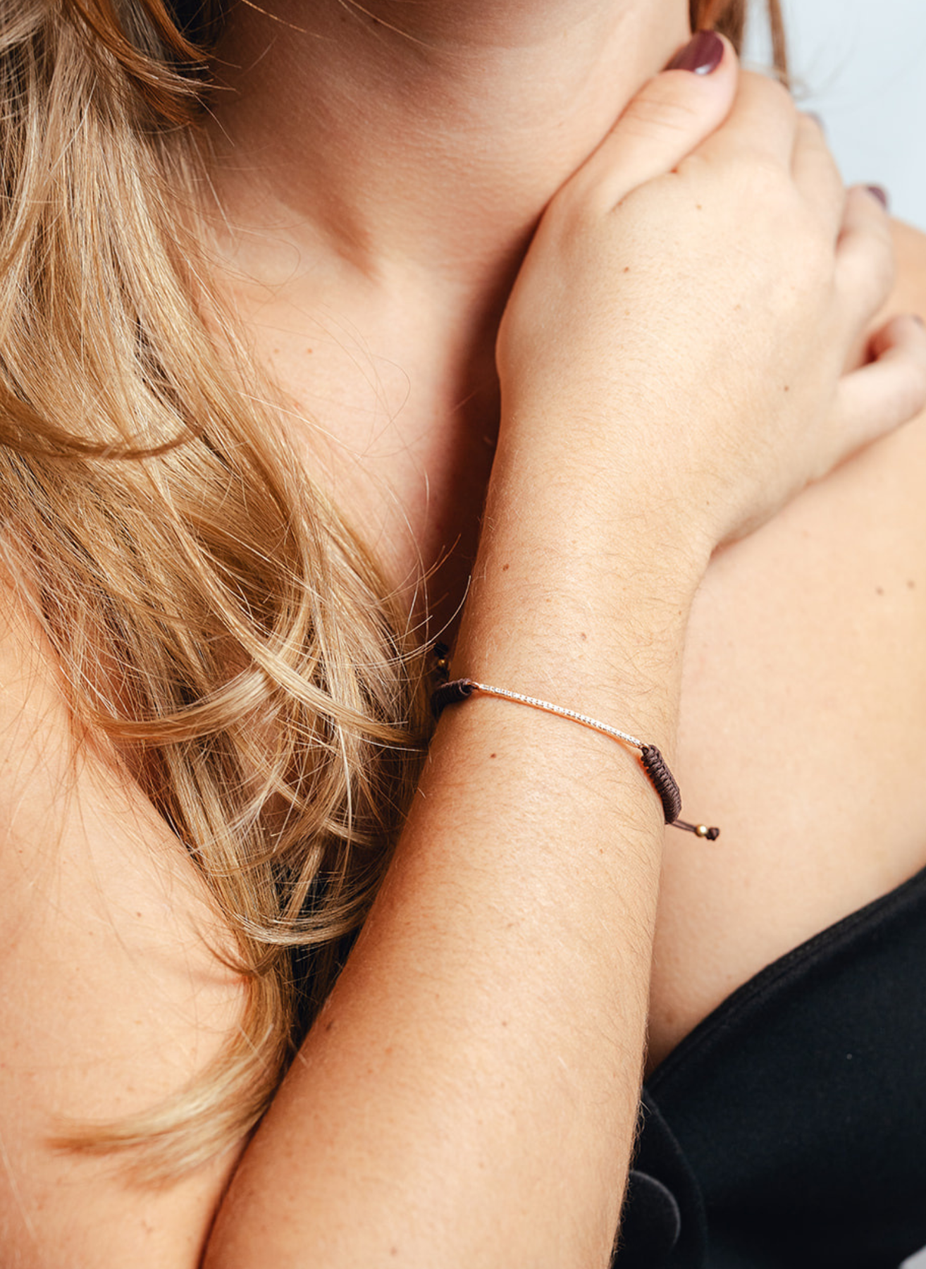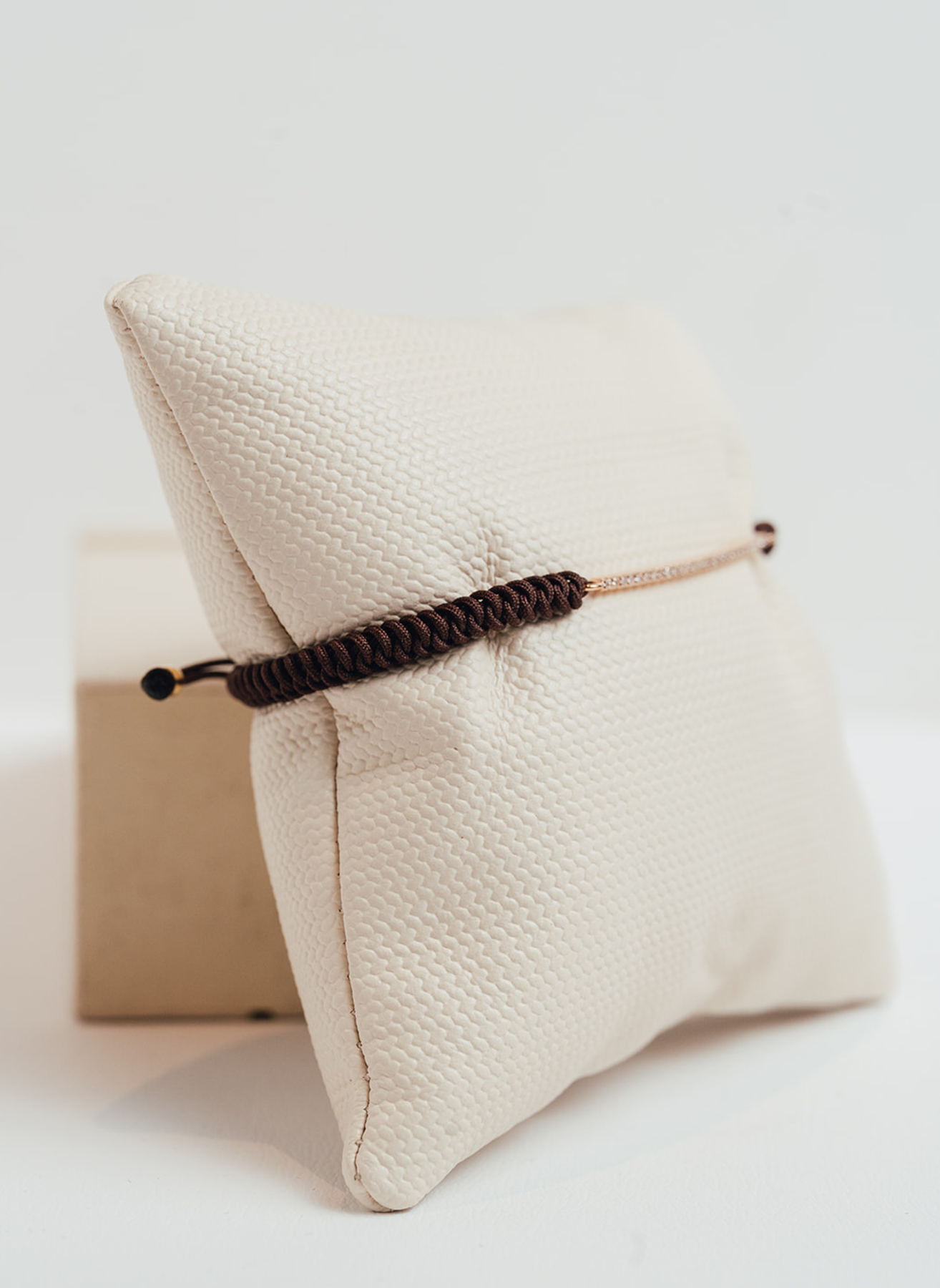 Pulsera Macrame Marron Ajustable de Oro Rosa y Brillantes