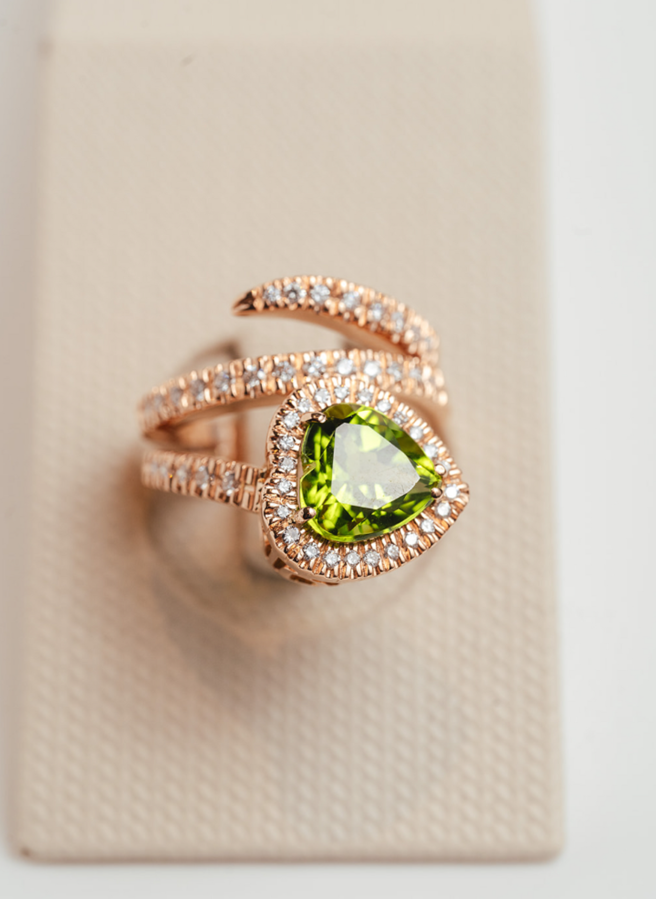 Anillo de Peridoto en forma de corazón, Oro Rosa y Diamantes Talla Brillante