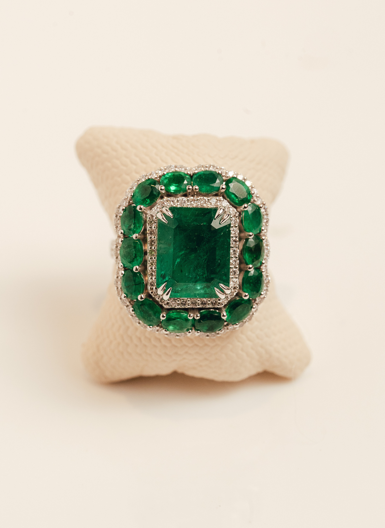 El segundo, es una joya de gran presencia, con una esmeralda central en corte rectangular rodeada por un doble halo de esmeraldas más pequeñas. Su diseño destaca por el brillo y la intensidad del color, transmitiendo elegancia y sofisticación.