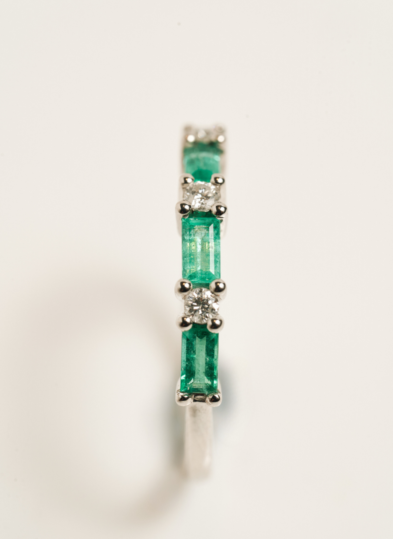 La primera opción, una media alianza con esmeraldas y diamantes, las esmeraldas en talla baguette aportan modernidad, mientras que los diamantes redondos dan un toque de luz que resalta aún más la intensidad del verde.