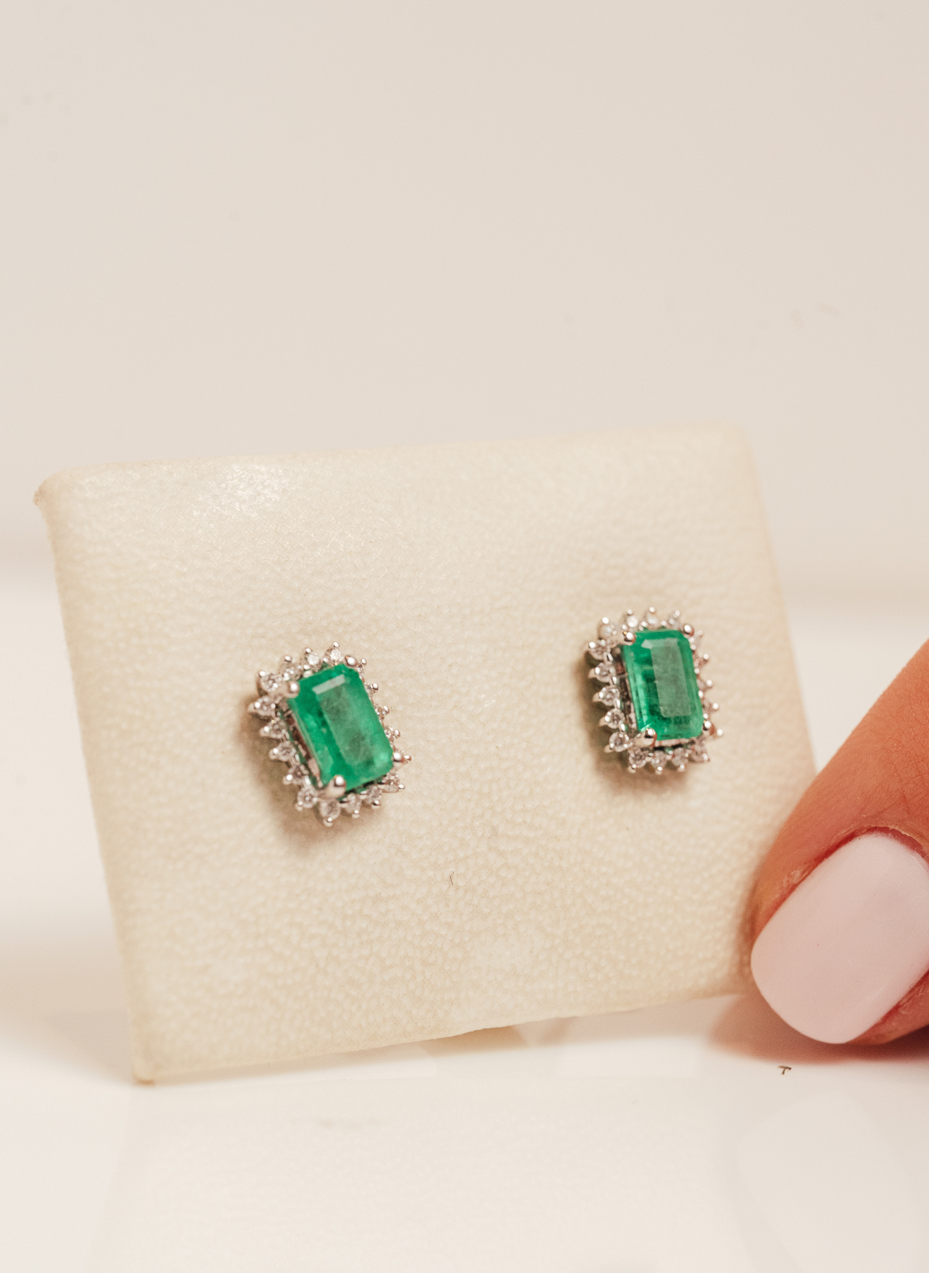 Los segundos, presentan una esmeralda rectangular rodeada por un delicado marco de diamantes blancos. Este diseño clásico y atemporal aporta brillo y luminosidad, realzando la pureza del verde esmeralda.