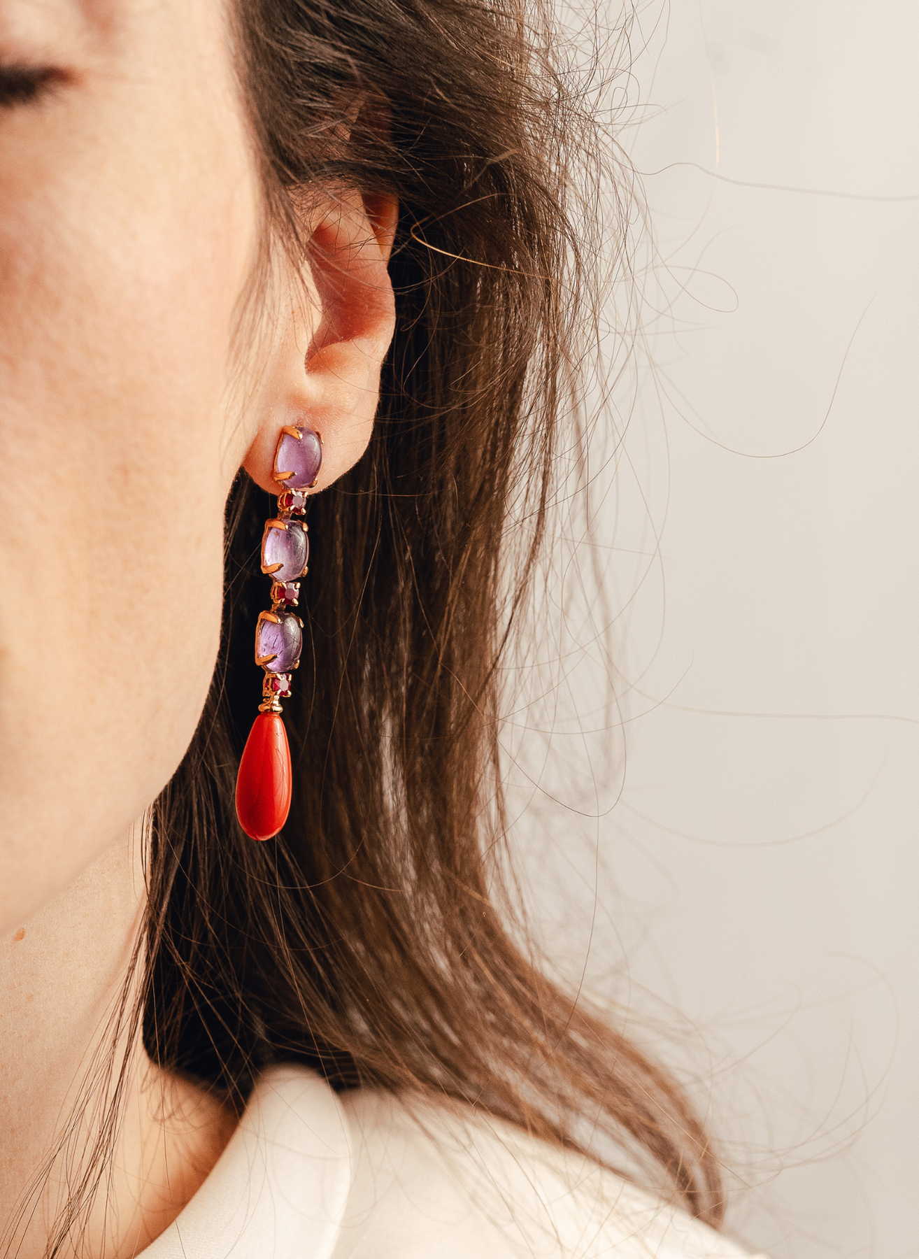 Materiales: Oro Amarillo de 18 Quilates, Amatistas y Coral