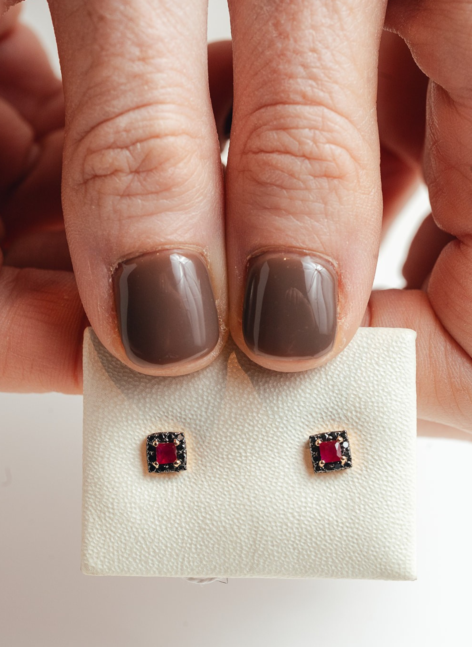 Pendientes Botón Pavé Cuadrado Oro Amarillo y Rubí